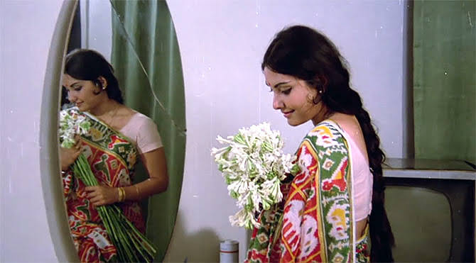 I began with a scene from Rajnigandha (1974) because it is my favourite, the quintessential Basu Chatterjee film with a deep understanding of human relationships and emotions narrated in all its simplicity. Deepa (Vidya Sinha) and Sanjay (Amol Palekar) are in love and are planning to get married, when a job interview takes Deepa to Mumbai and brings her close to Naveen (Dinesh Thakur), her lover from the past. There’s a certain magnetism in first love – they say we always leave a part of ourselves in the first person we ever fall in love with. Deepa cannot help but return to the past – she finds herself instinctively wearing a sari of Naveen’s favourite colour when she’s with him. There are possibilities of rekindling an old flame, and Naveen’s constant attention to her, his impeccable sense of time are suddenly too prominent against Sanjay’s. Sanjay is hardly ever on time, but comes up with elaborate excuses each time he’s late. On a movie date, Sanjay might just forget the tickets at home. On days Deepa dresses with care, Sanjay can almost never remember to compliment her on how she looks. But there is one thing that Sanjay never forgets – unfailingly, he brings her a bundle of fresh rajnigandhas every time they meet. Mixed with the scent of the flowers, there’s peace, a reminder of the comfort in Sanjay’s love.